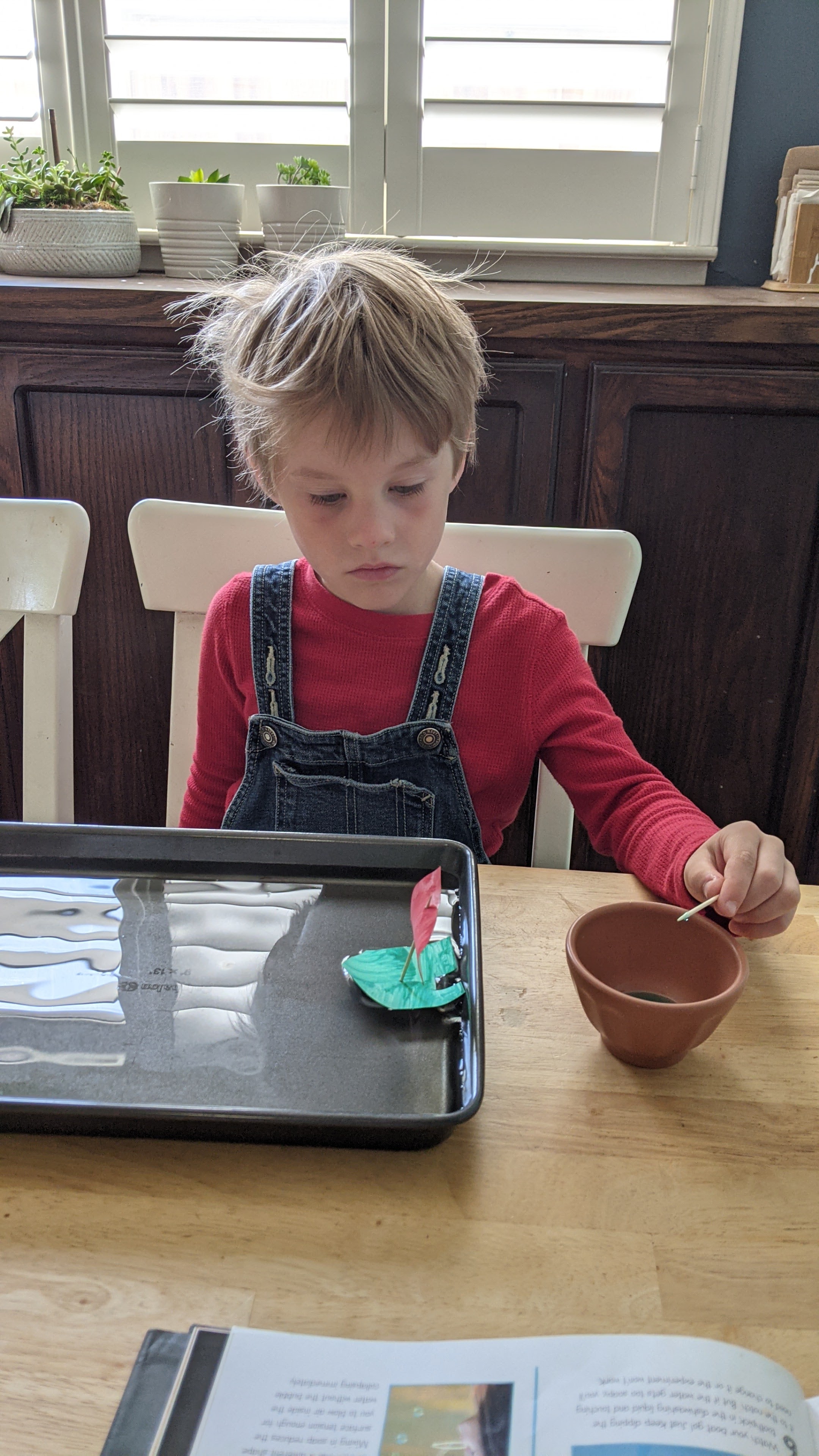 Trying his boat and soap experiment. It did not do well.